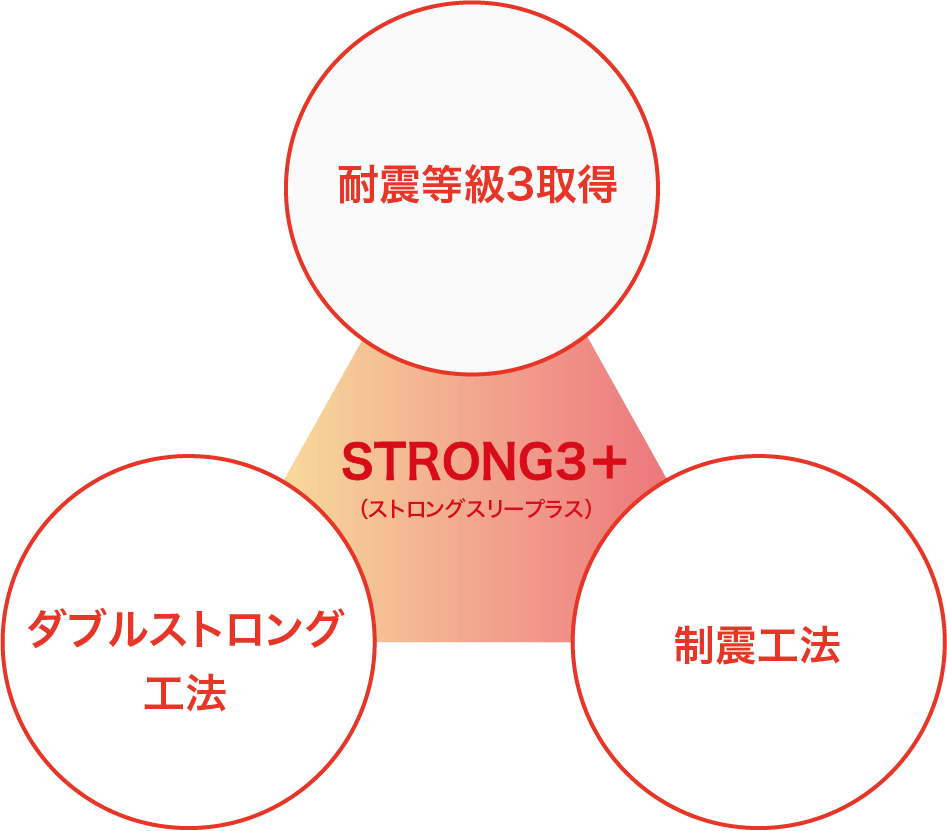 「STRONG3+」とは、地震に対する3つの強さを兼ね備えた構造です。