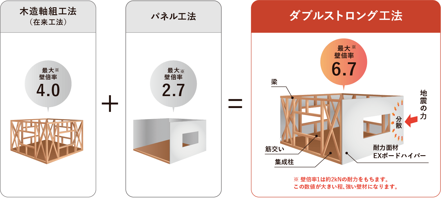 ダブルストロング工法とは「在来工法」に面材の強さを加えた耐震性能で、建物そのものの耐震性を強化した工法です。